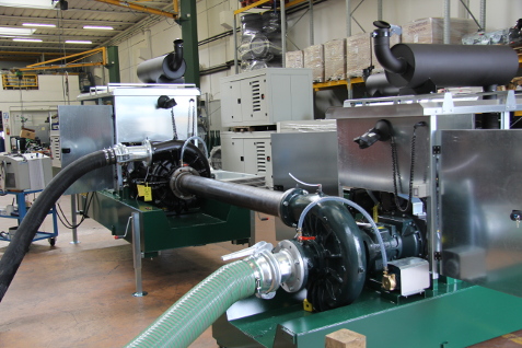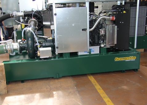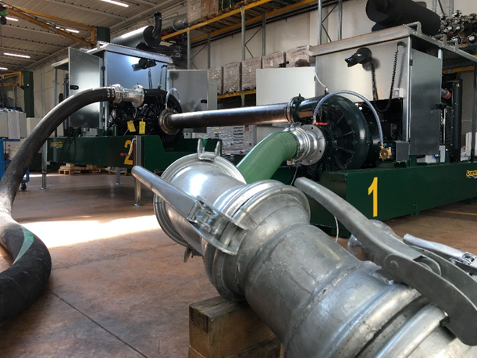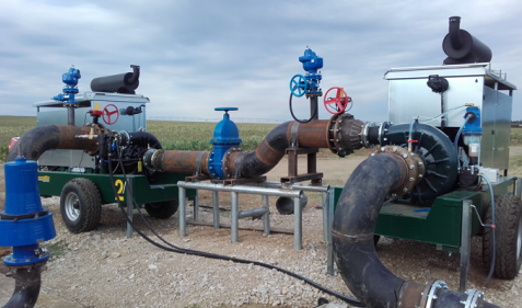 Using a Valley Pivot irrigation system, the pumps are set two each in series, with a capacity of 4750 GPM/ 300 l/s, and pressure of 12 bar. Using Iveco 6 Cly Turbo engines, the pumps discharge into 16” / 400mm lines.