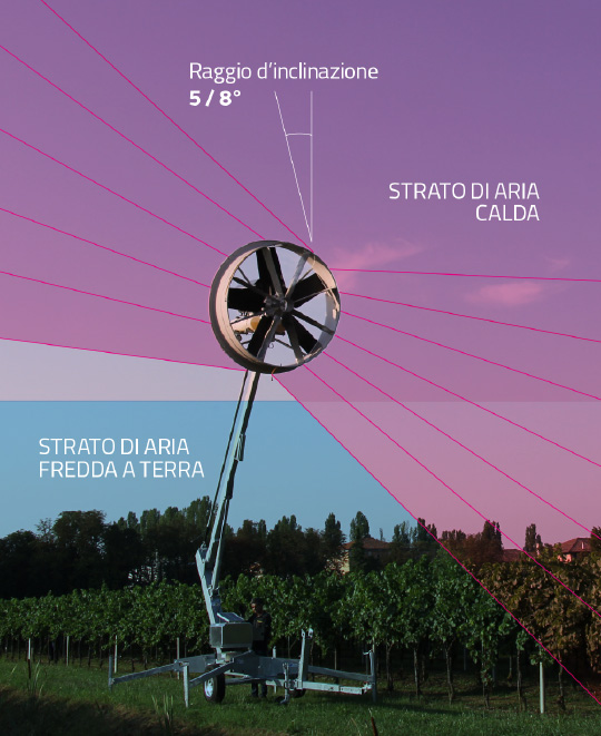 TOW & BLOW è la macchina del vento più efficace al mondo per contrastare il fenomeno dell’inversione termica che colpisce le aree collinari e pianeggianti durante i mesi primaverili.